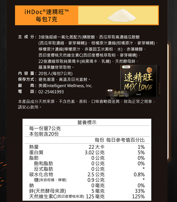 主要成分: L-精氨酸、一氧化氮促進劑、維生素C、維生素E