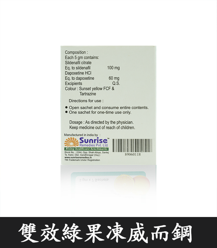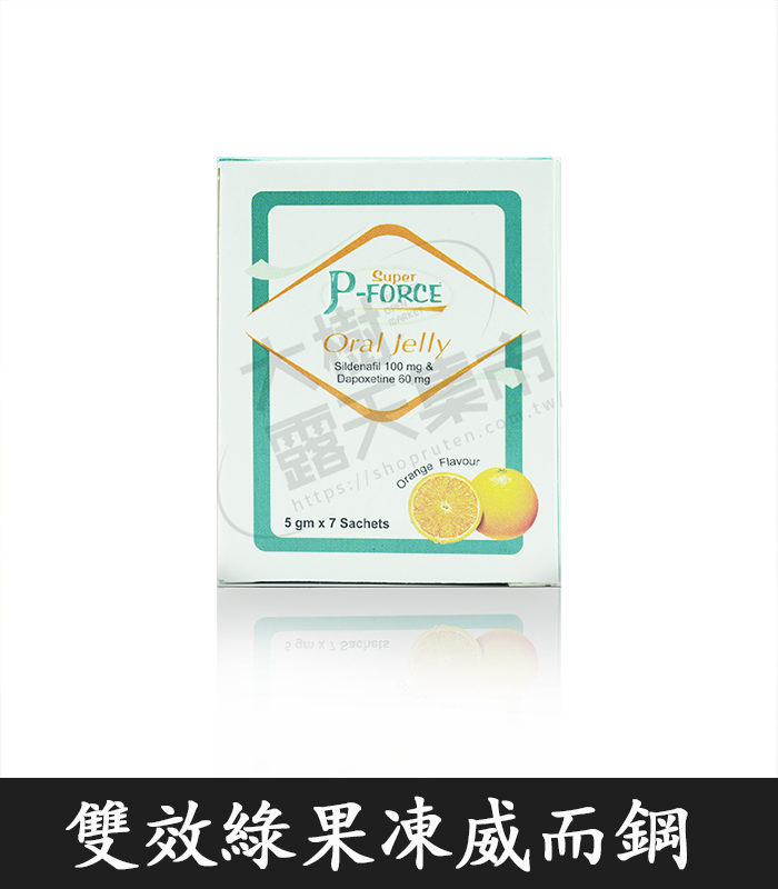 綠P果凍威而鋼 Super P-Force Oral Jelly,又稱液態水果威而鋼,雙效液態威而鋼是一種有效治療勃起功能障礙和早洩的藥物。Super P-Force Oral Jelly果凍威而鋼的主要活性成分是西地那非100mg和達泊西丁60mg,能增加陰莖的血液循環,刺激男性的自然性喚起與增長勃起與射精耐久時間,可以幫助使用者獲取長時間的勃起和強大的性高潮。