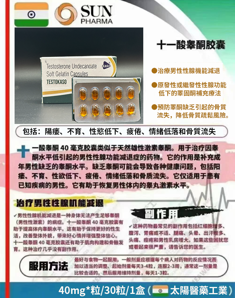 • 劑量:十一酸睪丸酮40毫克/粒。